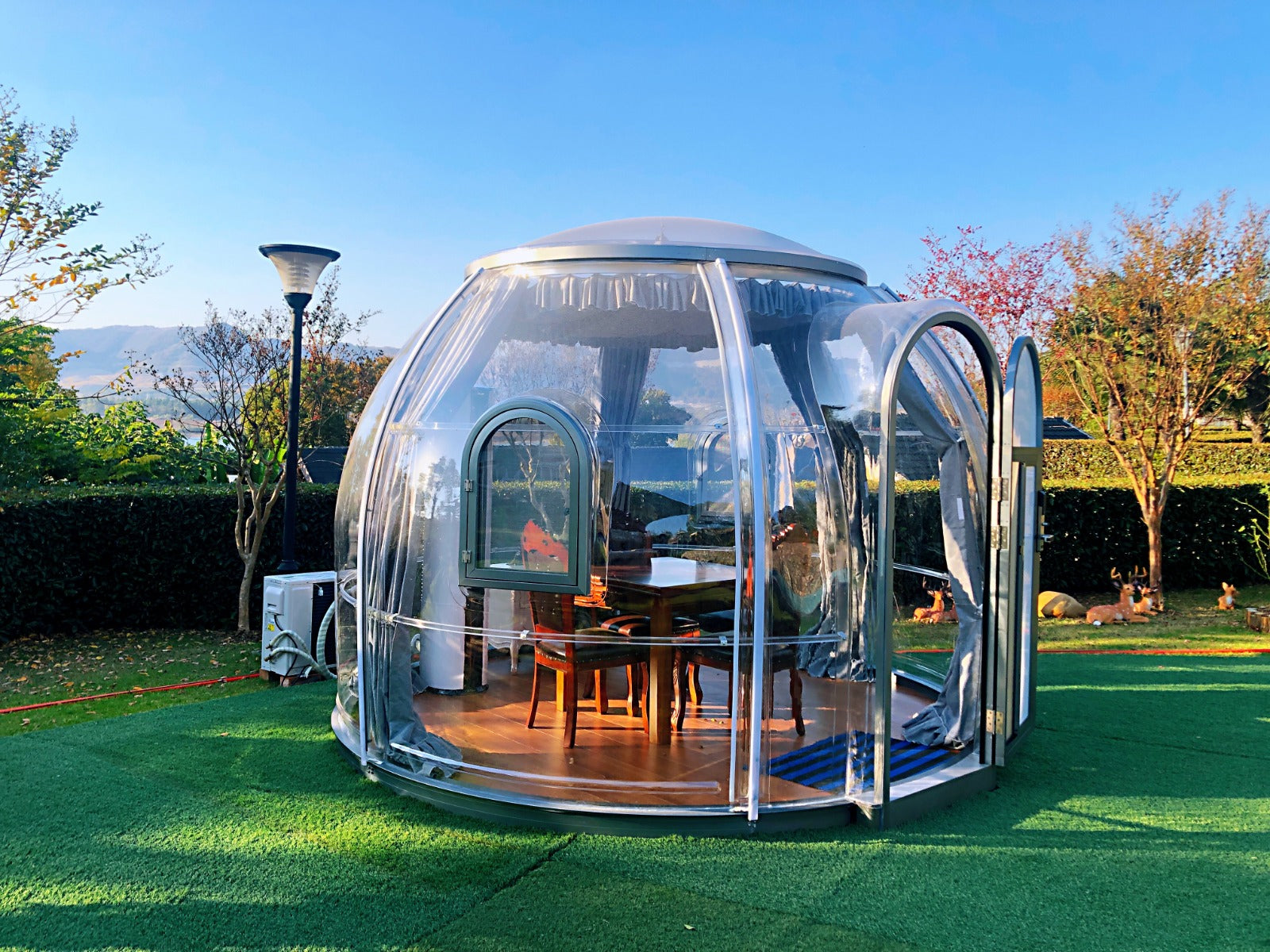 Die Kuppeln sind UV-beständig und schallisolierend, wodurch eine ruhige und geschützte Atmosphäre entsteht. Sie eignen sich perfekt für ein gemütliches Kurzzeitwohnen in malerischen Naturlandschaften – wetterunabhängig und mit höchstem Komfort!
