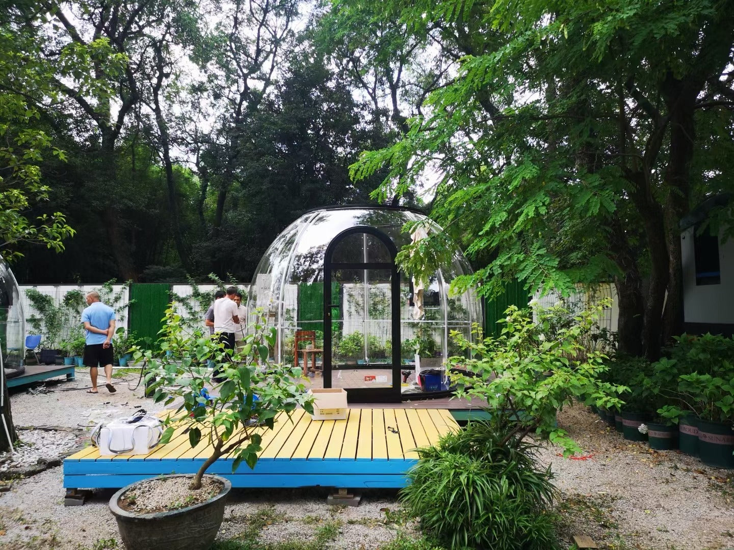 - Wölbende Wandelemente aus transparentem Polycarbonat im entsprechenden Radius, einschließlich Elemente mit Tür und Fenster.